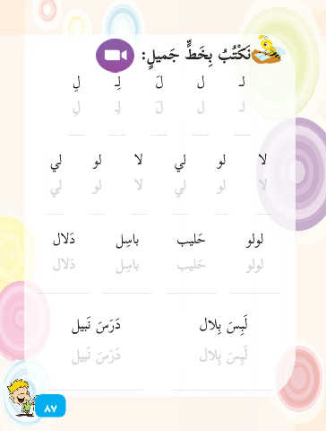 َن ْك ُت ُب ِب َخ ٍّط َجمي ٍل: لـ ل َل لِـ ِل لـ ل َل لِـ ِل لا لو لي لا لو لي لا لو لي لا لو لي لولو َحليب با ِسل َدلال لولو َحليب با ِسل َدلال َد َر َس نَبيل َل ِب َس بِلال َد َر َس نَبيل َل ِب َس بِلال ٨٧