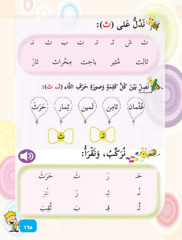 َن ُد ُّل َعلى )ث(: َن ِص ُل َب ْي َن ُك ِّل َك ِل َم ٍة َوصو َر ِة َح ْر ِف الثّاء )ثـ ،ث(: ُع ْثمان ثا ِمن َثمين ثِمار َح َر َث ثـ ث نُ َر ِّك ُبَ ،و َن ْق َرأُ: ١٦٥