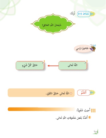 :ُدِّدرُن )٧( طاشَن َ ِ ِ !ِقلاخل� هّلل� َناحبس ْ ُ يسرَد ميهافم ْ ُ َ ِ ٍ َ ءيش ِّلُك ُقلاخ ىلاعَت ُهّلل� ْ ِ ُ َ .ِنوَكل� ُقلاخ ىلاعَت ُهّلل� مَّلعَتأ� ْ َ َ :ًاّيِوفش بيجأ� ُ ِ ِ ْ .ىلاعَت هّلل� تاقولخم ضْعَب ُدِّدَعأ� َ َ ٦٩ ٦٨