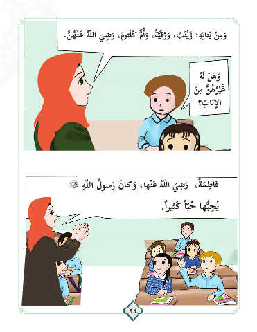 ِ ِ ِ ِ ُ َ .نُهْنَع ُهّلل� يضر ،َموثْلُك ُّمأ�و ،ةيقرو ،بَنْيَز :هتانَب نمو َّ َ ْ َ َّ ُ َ َ ُ َ ُهَل ْلَهو َ ِ َ نم نُهريغ َّ َ ُ ْ ِ ؟ثانِإ�ل� ِ ُ ِ هّلل� ُلوسر َناكو ،اهْنَع ُهّلل� يضر ،ةمطاف ِ َ َ َ َ َ ِ .ً�ريثَك ًابح اهبحُي ُ ُّ ّ ٢٤