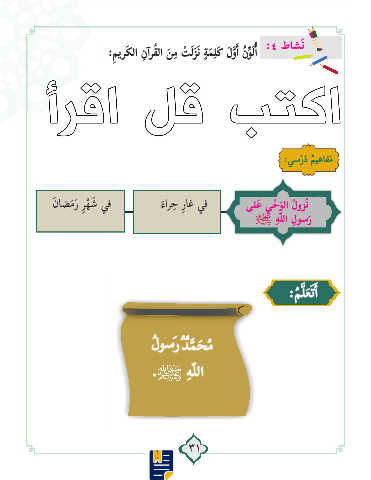 ِ ٍ ِ ُ :ميرَكل� ِنآ�رقل� نم ْ تَلَزَن ةملَك َلوأ� ُنوَلأ� :٤ طاشَن َ َّ ِّ ِ َ :يسْرَد ميهافَم ُ ِ َناضمر ِرهَش يف ءارح ِراغ يف ىلَع يْحول� ُلوزُن َ َ ْ َ ِ َ ِ هّلل� ِ لوسر َ ُ َ :مَّلعَتأ� ُلوسَر ُُُ َّ َ ُ ُُُدمحم ِ . هّلل� ٣١
