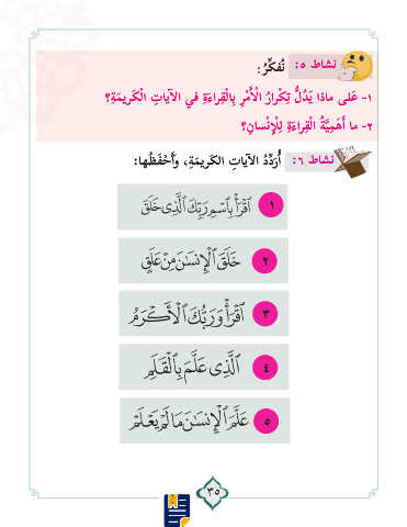 :رِّكفُن :٥ طاشن ُ ِ أ ْ ِ ْ ِ ْ ِ آ ِ ْ ؟ةميرَكل� تاي�ل� يف ةء�رقلاِب ِرْم�ل� ر�ركت ُّلُدَي �ذام ىلَع -١ َ ُ َ ِ ْ ُ ِ ِ ِ ْ ْ ؟ِناسنِإالل ةء�رقل� ةيمَهأ� ام -٢ َ َّ ِ ُ َ ِ آ :اهظفْحأ�َو ،ةميرَكل� تاي�ل� ُدِّدرأ� :٦ طاشن َ َ ١ ٢ ٣ ٤ ٥ ٣٥