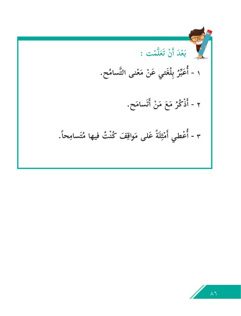 : تمَّلعَت ْنأا َدْعَب ْ َ .حماسَّتلا ىنْعم نَع يتَغُلِب ربَعأا - 1 َ ْ ُ ُ ِّ ْ .حماسَتأا نم عم رُكذأا - 2 ْ َ َ َ َ ُ ِ ِ ً ِ .ًاحماسَتم اهيف ُ تْنُك فقاوم ىلَع ةَلثْمأا يطْعأا - 3 َ َ ُ ٨٦