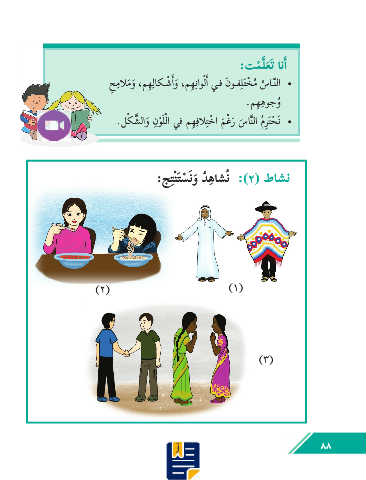 :تمَّلعَت انأا ْ َ ِ ِ ِ ِ ْ حمالمو ،مِهلاكــ ْ شأاو ،مِهناولأا يــف َنوــفلَتْخم ساــّنلا • َ ُ ِ َ َ ُ ِ .مِههوجو ُ ْ ِ ِ ِ ْ .لكَّشلاو نوَللا يف مِهفالتْخا مْغر ساَّنلا ُمِرَتحَن • ْ َ ْ َ َ َ ِ ِ :جتْنَت ْ سَنو ُدهاشُن :)2( طاشن َ )٢( )١( )٣( ٨٨