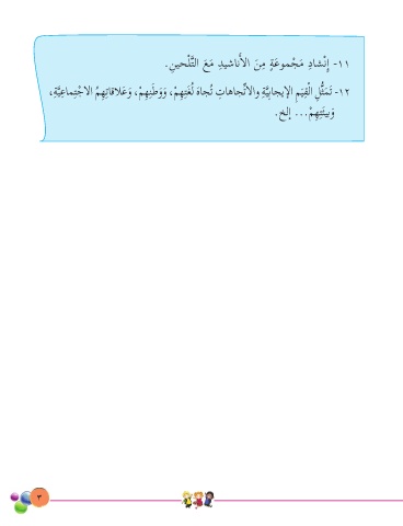ِ ِ ٍ ِ أ .ِنيحْلَّتلا عم ديشان�لا نم ةعومجم داشْنِإا -11 َ َ ْ َ َ َ ِ ِ ِ ِ ِ ِ ِ ْ ِ ِ َ ،ةيعامتج�لا مِهتاقالعو ،مِهنطوو ،مِهتَغُل هاجُت تاهاجِّت�لاو ةيِباجيإ�لا ِميقلا ِلُّثمَت -12 ْ َ َ َ ْ َ َ ْ َّ َ َّ ُ َ ِ .خلإا ...مِهتَئيبو َ ْ ٣