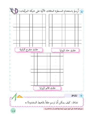 :تاعبرملا ةكبش ىلع ةيتآ�لا تاثلثملا ةرطسملا ِمادختساب مسرأا ٨ َّ ُ ةيوازلا جرفنم ثلثم اياوزلا داح ثلثم اياوزلا مئاق ثلثم طاشن 9 * ؟دودشملا طيخلاب ًاثلثم مسرن نأا نكمي فيك :طاشن ةسردملا ةحاس وأا فصلا ةفرغ ةيضرأا ،ىوقم نوترك ىلع طاشنلا ذيفنت متي * 107