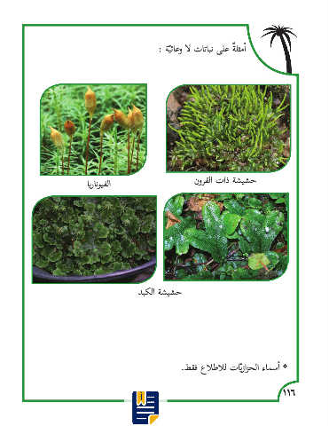 �أمثل ٌة على نباتات لا وعائ ّية : حشيشة ذات القرون الفيوناريا حشيشة الكبد * �أسماء الحزازيّات للاطلاع فقط. 116