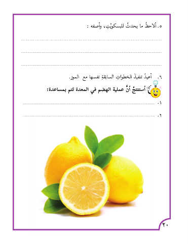 � .5ألاح ُظ ما يحد ُث للبسكوْي ِت ،و�أصفه : � . ٦أعي ُد تنفي َذ الخطوا ِت السابق ِة نفسها مع الموز. أ�ستنت ُج أ� َّن عملية الهضم في المعدة تتم بمساعدة: .١ .٢ 20