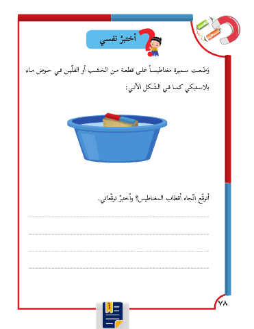 أ�ختب ُر نفسي َو َضعـت سـميرة مغناطيسـاً علـى قطعـة مـن الخشـب �أو الفلّيـن فـي حـوض مـاء بلاسـتيكي كمـا فـي ال ّشـكل ال�آتـي: �أتوقّع اتّجاه �أقطاب المغناطيس؟ و�أختب ُر توقّعاتي. 78