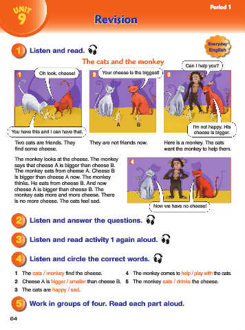 2 Cheese A is bigger / smaller than cheese B. 5 The monkey eats / drinks the cheese.