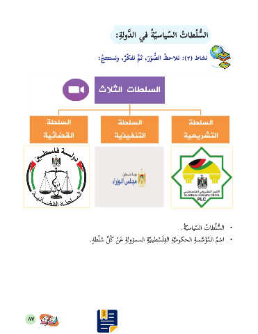ِ ُ :ةلوَّدلا يف ةيسايسلا ُ تاطُلسلا ّ ُّ ّ : ُ جتنتسنو ،رّكفن َّمث ،رو ُّ صلا ُ ظحالن :)٢( طاشن ُ َ َ .ُةيسايسلا ُ تاطُلسلا ّ ُّ ّ ِ ِ ِ ٍ ِ ِ .ةطْلس ِّلُك نَع ةلوؤسملا ةينيطسَلفلا ةيموكحلا ةسسَؤملا مسا ْ ّ ْ َّ ُ ُ ْ ُ َّ 87
