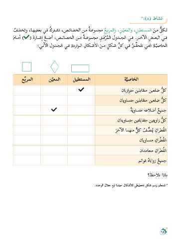 لـك ٍّل مـ َن المسـتطي ِل ،والمع ّيـ ِن ،والمربـ ِّع مجموعـ ٌة مـن الخصائـص ،تشـتر ُك فـي بع ِضهـا ،وتختلـ ُف